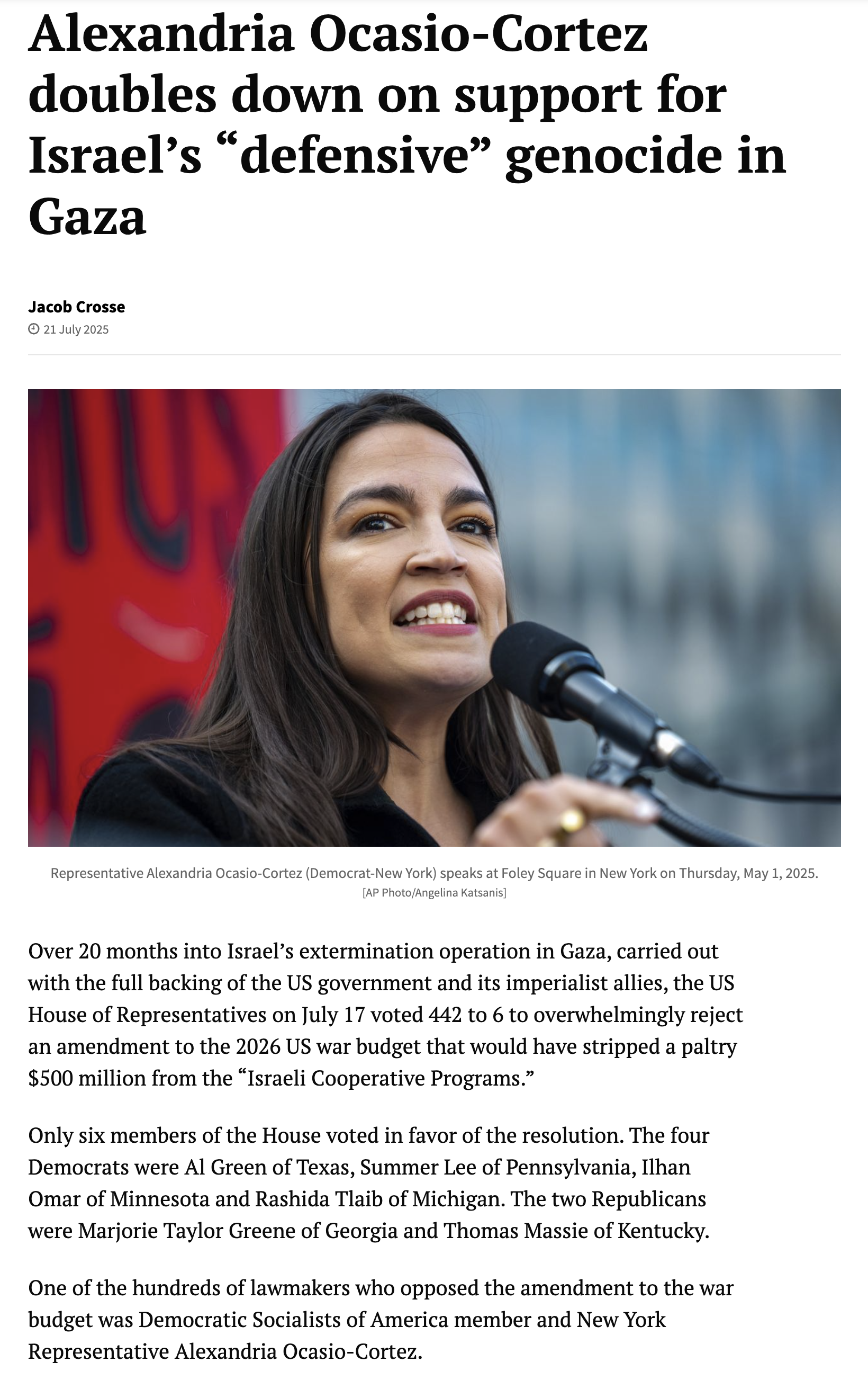 >>529486141https://www.middleeasteye.net/live-blog/live-blog-update/democratic-socialists-america-withdraws-support-ocasio-cortez-over-gazaNot taking AIPAC money is great. There should also be more you should dig into. This isn't a purity test, these are serious things including Democratic Socialists disowning her for Zioinst tendencies.