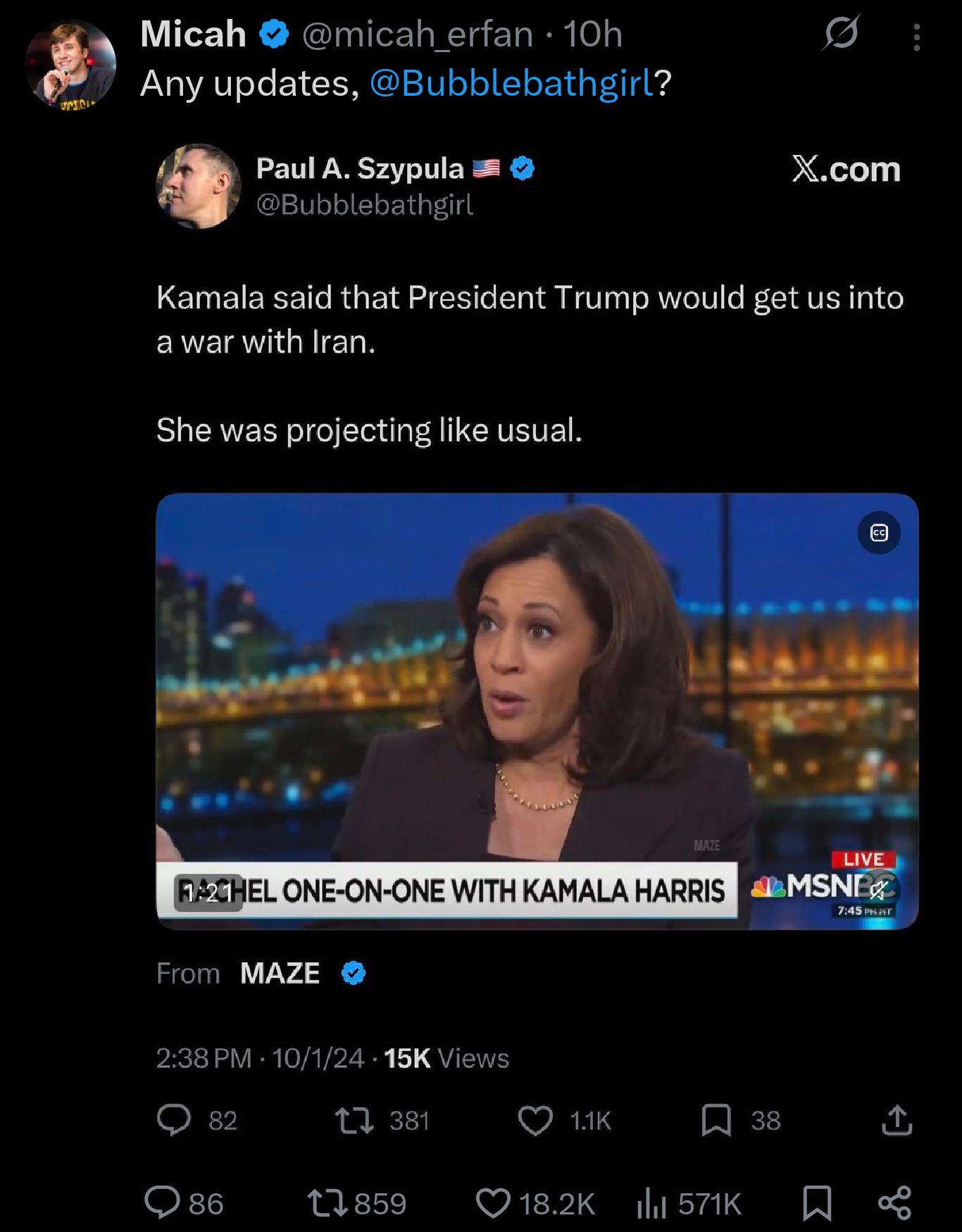 Kamala said that Trump would get us into a war with Iran. Laughed out of the room by the power brokers.Can we find this video?