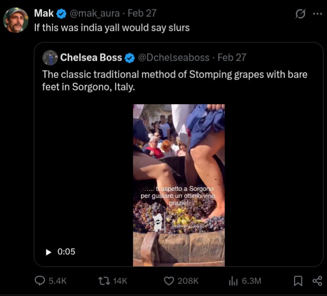>>529491775Indians would also say slurs if they drank what they thought was Italian wine, before being told another Indian's feet touched the grapes.