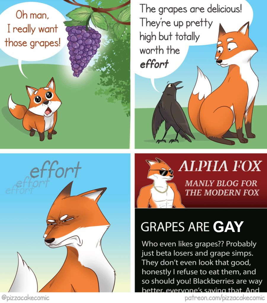 >>529494159I don't even know what the grapes represent.Is Pizzacake implying that all men secretly want her? Is she comparing herself to fruit? Do "alpha males" think that wanting women is gay? What even is all this shit?I guess I'm not chronically online enough to understand this blather.