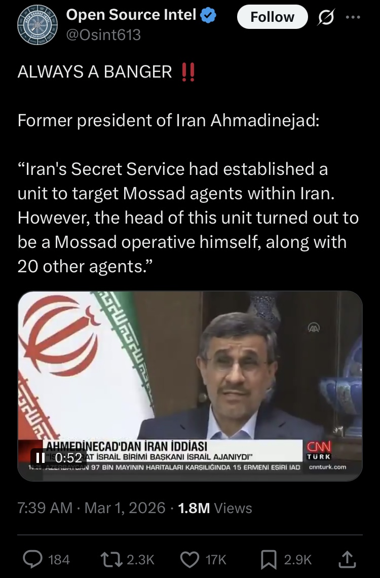 >>529494710Bruh, he's former leader of Iran. Former leaders don't have access to current secret information. I'm sure Bill Clinton doesn't have access to current information about how much time Trump spends deepthroating Netanyahu or other Israelis.