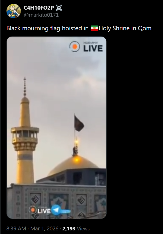Black flag of mourning has been raised above the Holy Shrine in Qom