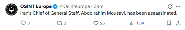 >Iranian state media announced the death of Armed Forces Chief of Staff Abdolrahim Mousavi.