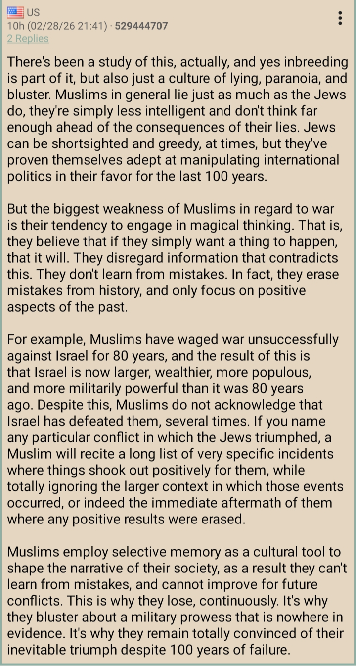 >>529498979UAE, Kuwait, Israel are all literally on fire and still getting bombed. Your monkey government literally imprisons people for taking pictures of the damage. Missiles are literally coming down AS I TYPE THIS. Ask any Israeli they have had air sirens on all fucking day. This board is 85 IQ brown people, I swear to god native Europeans are not this retarded.