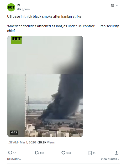 US base in thick black smoke after Iranian strike'American facilities attacked as long as under US control' — Iran security chief March 1st, 2026 https://x.com/RT_com/status/2027996672639570120 3/1/2026 https://files.catbox.moe/6ocval.mp4