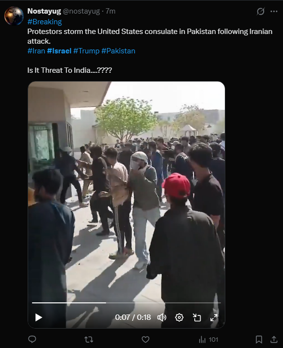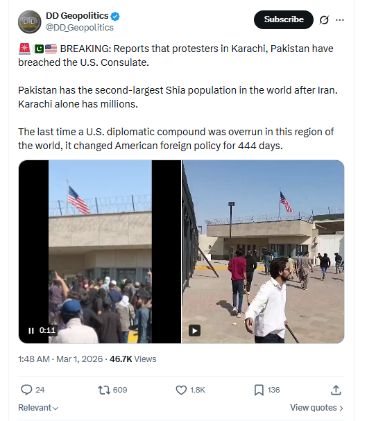 BREAKING: Reports that protesters in Karachi, Pakistan have breached the U.S. Consulate.Pakistan has the second-largest Shia population in the world after Iran. Karachi alone has millions.The last time a U.S. diplomatic compound was overrun in this region of the world, it changed American foreign policy for 444 days. March 1st, 2026 https://x.com/DD_Geopolitics/status/2027999418591654180 Video 1 3/1/2026 https://files.catbox.moe/vopx56.mp4 Video 2 3/2/2026 https://files.catbox.moe/fz7a1t.mp4