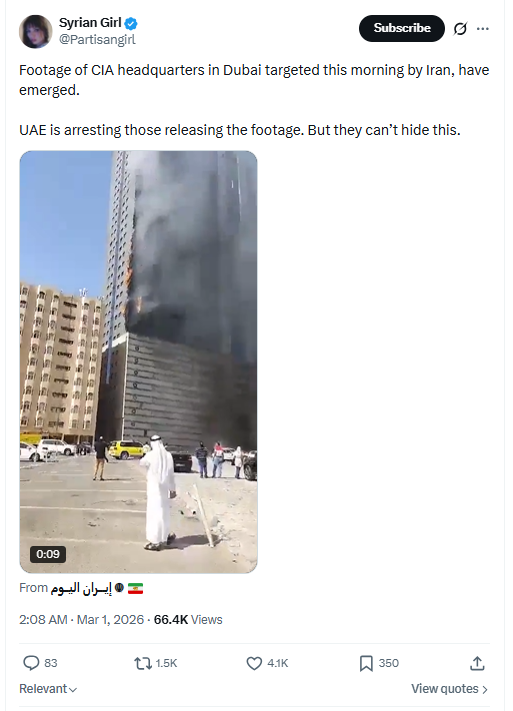 Footage of CIA headquarters in Dubai targeted this morning by Iran, have emerged.UAE is arresting those releasing the footage. But they can’t hide this. March 1st, 2026 https://x.com/Partisangirl/status/2028004387587756357 3/1/2026 https://files.catbox.moe/vs9zzl.mp4