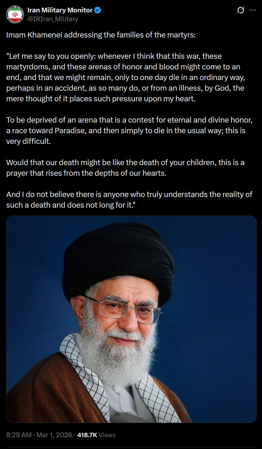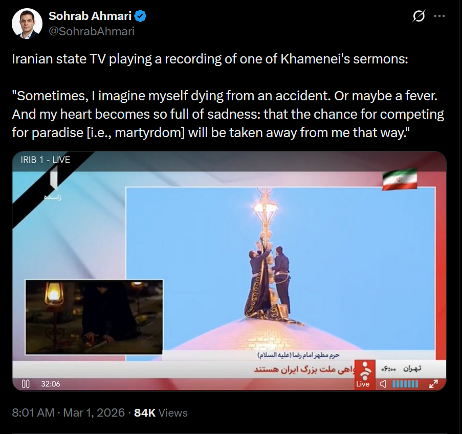 >The Secretary of Iran's Supreme National Security Council Ali Larijani on who will replace Khamenei: "According to Article 111 of the Iranian Constitution, in the event of the death of the supreme leader, the Council of Experts must elect a new supreme leader as soon as possible. This Sunday, the Council of Experts will be convened and begin its work."
