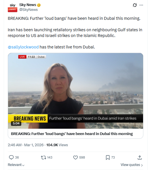 BREAKING: Further 'loud bangs' have been heard in Dubai this morning. Iran has been launching retaliatory strikes on neighboring Gulf states in response to US and Israeli strikes on the Islamic Republic. @sallylockwood has the latest live from Dubai. March 1st, 2026 https://x.com/SkyNews/status/2028013938302943304 3/1/2026 https://files.catbox.moe/3xxlng.mp4