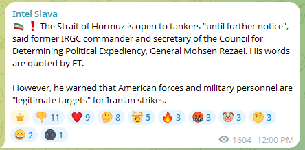 >Iranian National Security Council Secretary Ali Larijani: "In the previous war, we suffered many casualties, but yesterday the number of our martyrs was very low; the armed forces are fully in control thanks to their prior experience. In the coming days, we will have ups and downs, but the overall outlook will be bright."