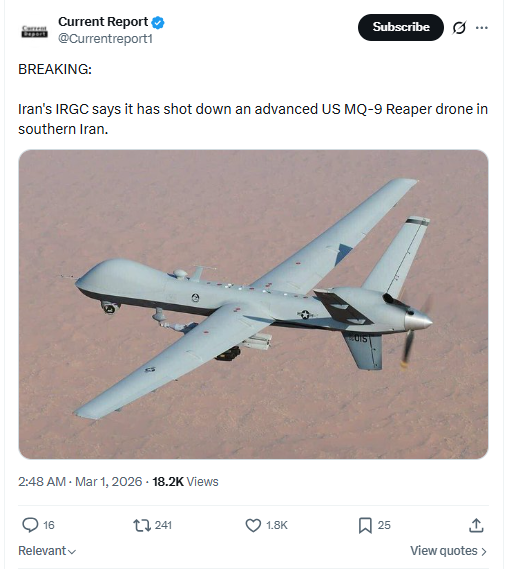 BREAKING:Iran's IRGC says it has shot down an advanced US MQ-9 Reaper drone in southern Iran. March 1st, 2026 https://x.com/Currentreport1/status/2028014606447489072