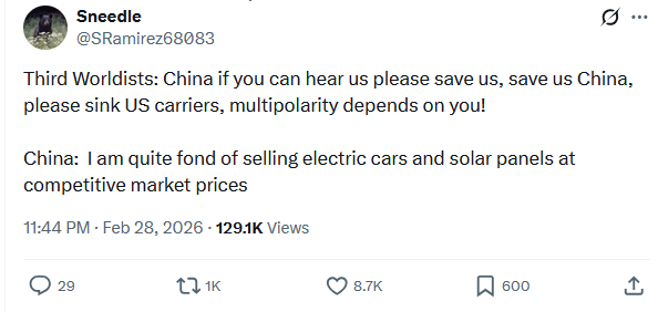 >>529502240They don’t really have much reason to care, and even if they did, they lack the real ability to change things anyway. If the entire political sphere they’ve been building suddenly implodes, cucks out, or just fucks off and dies a slow death, it’s honestly no big deal to them.Unlike Russia, they don’t border or even functionally border their most immediate rivals. They also haven’t forced the kind of self-isolation you see with Russia, Iran, or North Korea. Chinese people and products are fucking everywhere.They can also weather a total geopolitical reversal better than almost anyone. If suddenly playing nice with the West became the only way to survive, China is already the junk maker of the world, while Russia or Iran would be in far worse shape because they don’t really offer the West much of value.If geopolitics is a poker game, China has a perfectly decent hand. It would be stupid to go all in, but they’re far from holding a random bunch of garbage cards.them. Their actual concerns are mostly internal these days like the party carrying out purges more and more frequently, and the internal situation starting to feel like a house of cards.