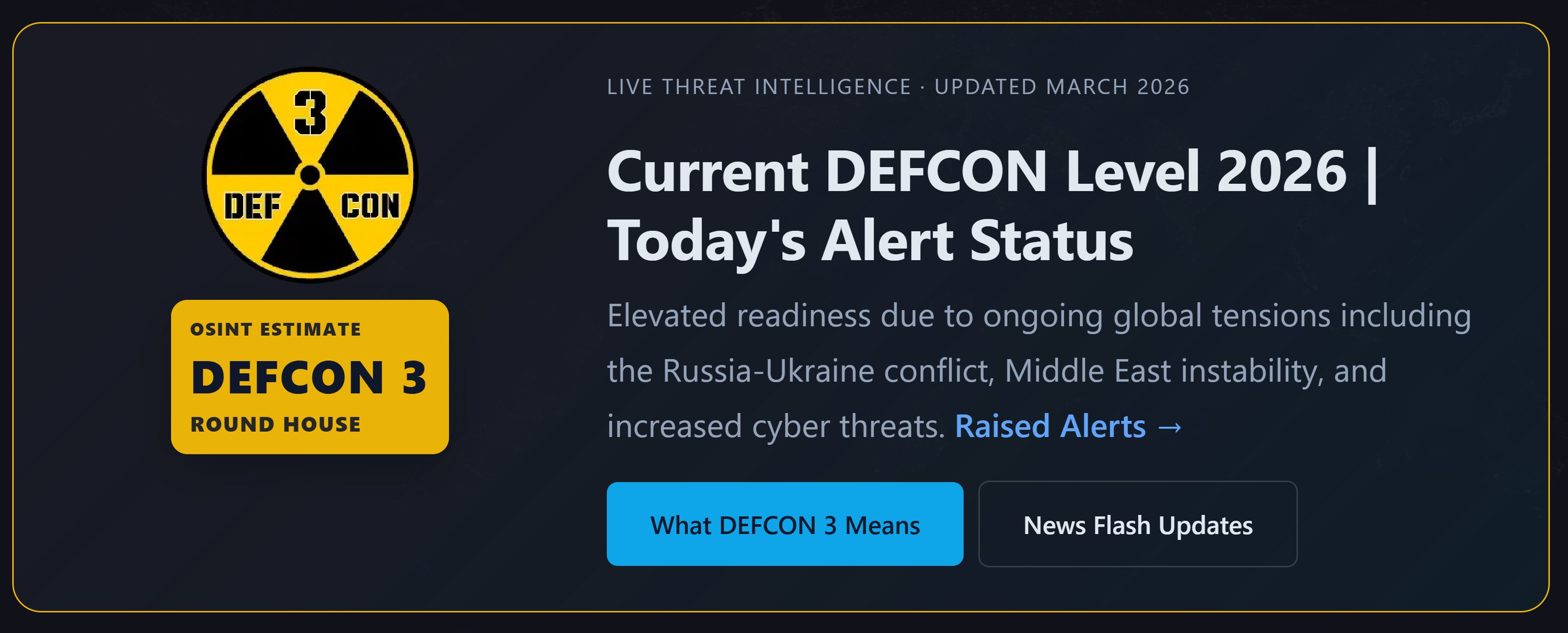 The site offers OSINT estimates, which are not official DEFCON levels. Official levels are classified and not made public in real-time.