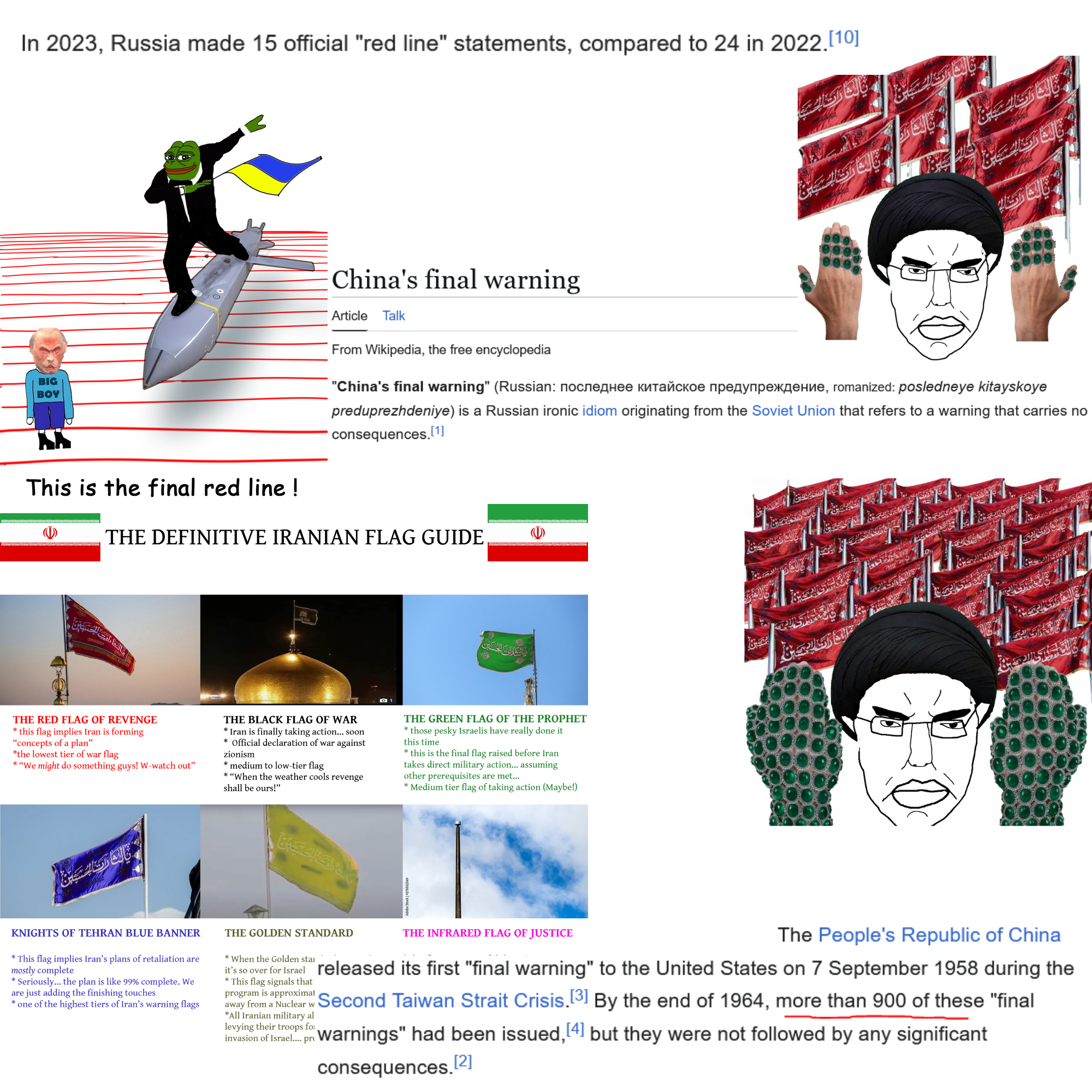https://en.wikipedia.org/wiki/China%27s_final_warninghttps://en.wikipedia.org/wiki/Red_lines_in_the_Russo-Ukrainian_war>sir, SIIIIIIIR!!! YOU CAN'T CROSS THIS REDLINE™ BY THE WAY!>SIR THIS TIME IS THE FINAL ULTIMATE LAST 9000 DELUXE WARNING™ I SWEAR IT'S REAL THIS TIME!Why the FUCK are they like this? Won't do shit club.