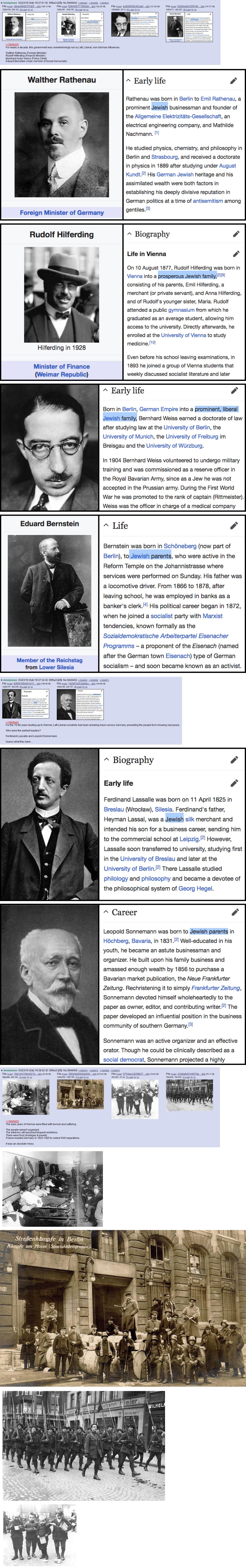 >>529512537Look at how insane your argument is:>This guy is Jewish. He studied physics, he has a doctorate.>Weimar republic debauchery happened because of THIS guy.Like, it's a non sequitur. If at least there was a second piece of info, "He's a Jewish scientist... AND, he raped many and did this and that etc etc", but there's nothing.Highlighting the words "Jewish" in a Wikipedia article is no indication of actual objective bad doing. Unless your ONLY criterium is the following of that religion itself, in which case, I too can do the same: everyone that enjoys, I don't know, orange juice? is also a monster.