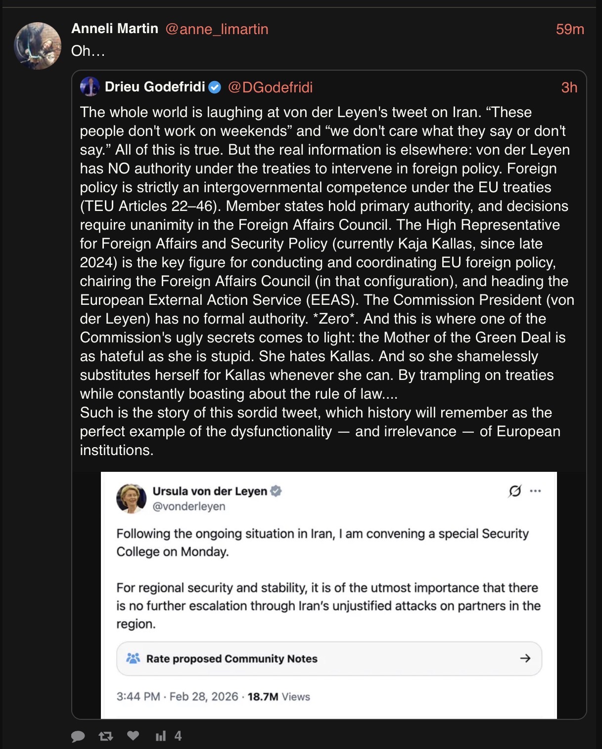 Thats the first time I hear that my mommy dont like my other mommyin any case the EU is at best a "state in being". but in reality is just a trade zone with some small competencies attached. its less federal than even a confederation. it has no army, taxes, civil law, police etc. look at the EU budget: it's 5x smaller than even my tiny ass nationfrankly its punching way above its weight with half the world treating it as a federal state