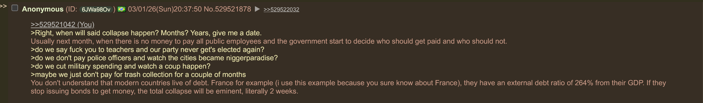>>529521042>Right, when will said collapse happen? Months? Years, give me a date.Usually next month, when there is no money to pay all public employees and the government start to decide who should get paid and who should not.>do we say fuck you to teachers and our party never get's elected again?>do we don't pay police officers and watch the cities became niggerparadise?>do we cut military spending and watch a coup happen?>maybe we just don't pay for trash collection for a couple of monthsYou don't understand that modern countries live of debt. France for example (i use this example because you sure know about France), they have an external debt ratio of 264% from their GDP. If they stop issuing bonds to get money, the total collapse will be eminent, literally 2 weeks.