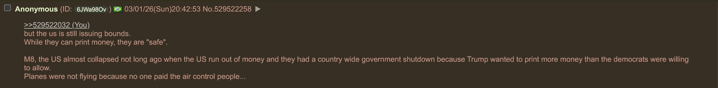 >>529521878>Usually next month, when there is no money to pay all public employees and the government start to decide who should get paid and who should not.OK, so if next month the US doesn't go into total collapse, I will repost this, hope you are here to see it.>You don't understand that modern countries live of debtAnd you don't understand that a debt that cannot be collected is not a debt.But I think you actually do understand this, you just can't say it because for some reasons you believe in the "economy" cult.