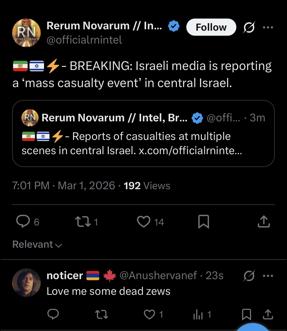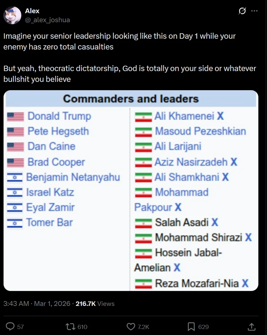 >brown people killing each other while americans just get to fly around dropping bombs with 0 regrets or actions taken against themThis is the best timeline. The only thing that would make it better is if Trump took Bibi out while Israel is weakened, but sadly we know that won't happen. I hope all the browns kill each other soon though!