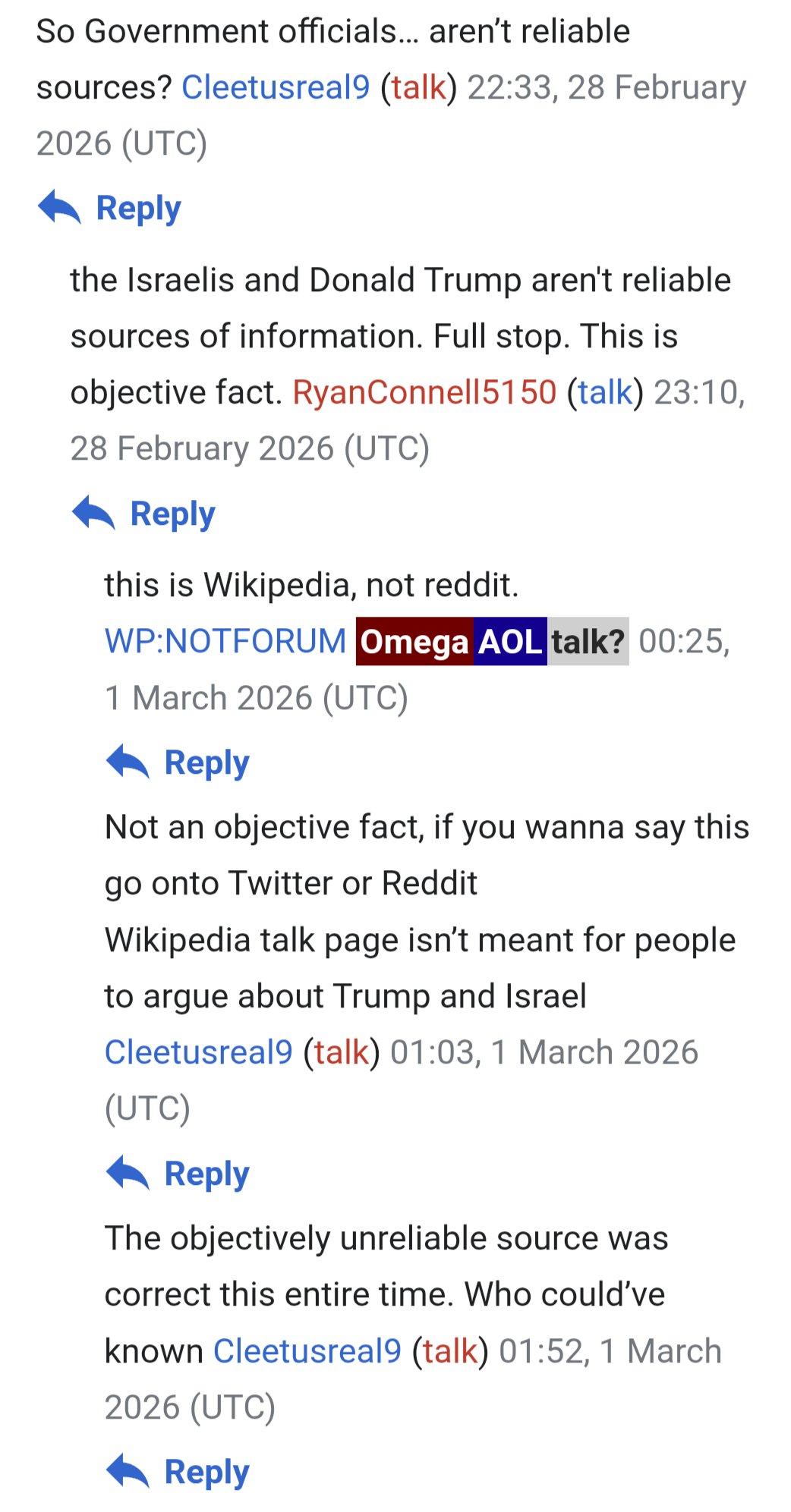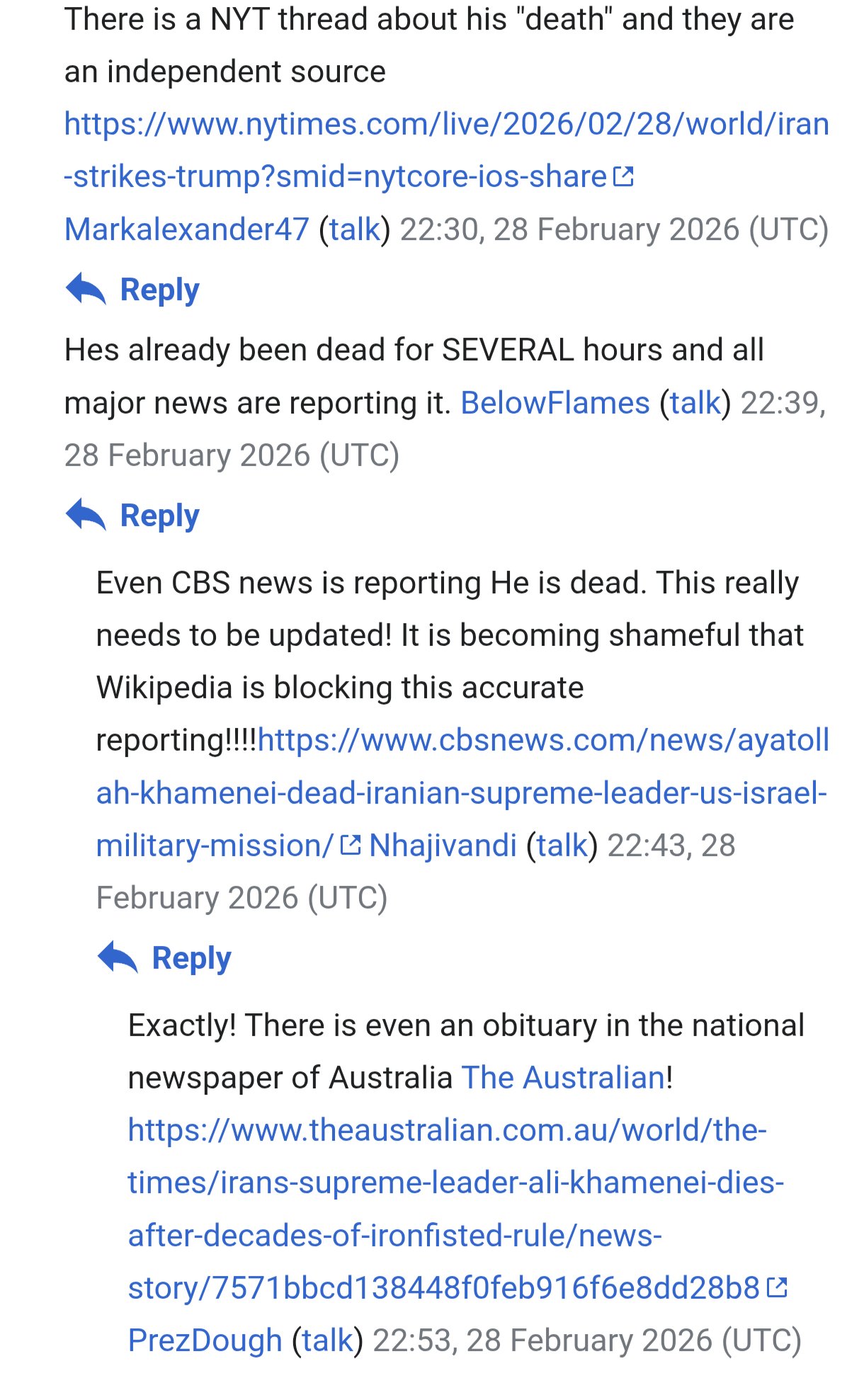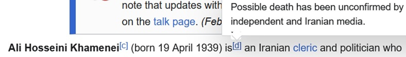 Angry leftist Wikipedia editors spent all day refusing to admit Ali Khamenei was dead, as if they were in such a deep state of delusion and denial that they thought a few bytes of text could alter reality itself. At one point the article was just locked with some sort of source/citation next to the word "is". Some argued that this could remain unconfirmed for months and Western media simply aren't reputable enough to make the call. At a certain point the admins had to come in and throw their weight around. How did these people get to this point in their lives?