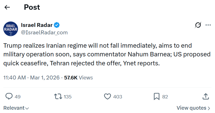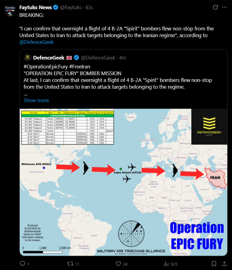 Day: 1Previous: >>529515601▶Latest>De-facto Iranian leader Ali Larijani says: "Today we will hit U.S. and Israel with a force that they have never experienced before">Israeli Defense Minister Katz: "From now on, a continuous air bridge will operate to carry out powerful strikes on Tehran">Iran's Supreme Leader Ayatollah Ali Khamenei has been killed>Oil tankers are avoiding the Strait of Hormuz>Iran simultaneously fires ballistic missiles at: Saudi Arabia, UAE, Qatar, Kuwait, Bahrain, Oman, Jordan and Iraqi Kurdistan>Israeli/US bombing also targets Iran-backed militias in Iraq>Iranian ballistic missiles launched at Israel>Iran, Iraq, Syria, Israel, Qatar and UAE close their airspace>Trump declares regime change operation dubbed "Operation Epic Fury">Supreme leader & President's residence targeted>Iranian Navy and IRGC sites obliterated>U.S. & Israel launch a joint operation, blasting Iran▶Livestreamshttps://www.youtube.com/watch?v=4E-iFtUM2kkhttps://www.youtube.com/watch?v=JHwwZRH2wz8▶Telegramhttps://rentry.org/tgnews▶Twitter accounts (using proxy frontend because twitter's UI is trash):https://nitter.net/clashreporthttps://nitter.net/FaytuksNetworkhttps://nitter.net/sentdefender▶Israel Rocket Alertshttps://www.tzevaadom.co.il/en/▶Air Traffichttps://www.flightradar24.com/https://flightaware.com/livehttps://globe.adsbexchange.com▶Maritime Traffichttps://www.marinetraffic.com/https://www.vesselfinder.com/