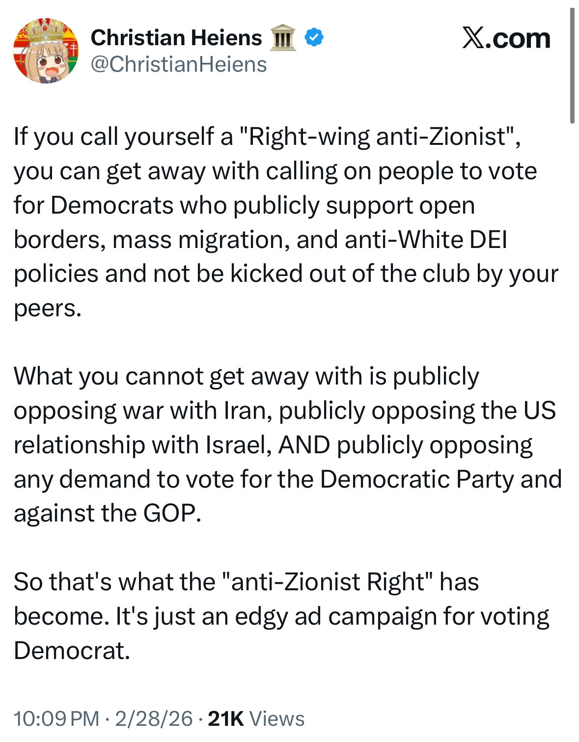 Campaigning against vance in 2028 would be so easy, all you would need is a 15 second ad, 7 1/2 seconds showing his tweet where he said Trump was an islamophobe American Hitler who scares his Islamist friends, and 7 1/2 seconds of a still frame of vance’s trans cross dressing New Year’s Day party photos from Yale