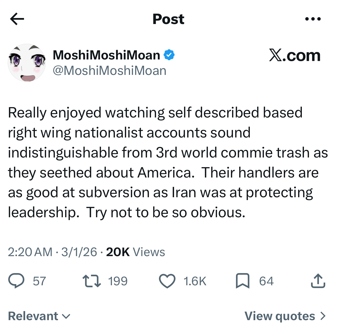 >>529532311>>529532380Shilling for Iran who wants death to all Americans by so called redpilled groypers is so unintentionally funny to me