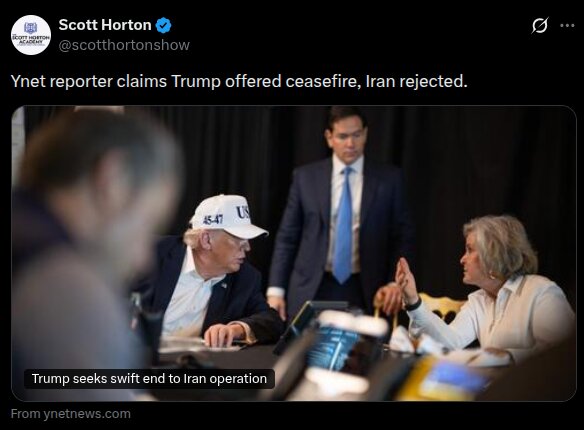 >BREAKING: Yesterday, the U.S. reached out to Iran through Italy, suggesting a ceasefire; Tehran 'rejected the idea outright' – Yedioth Ahronoth