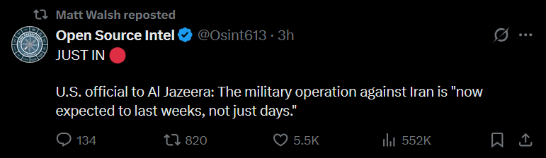 >Trump expects the regime change operation to take 4 weeks or more