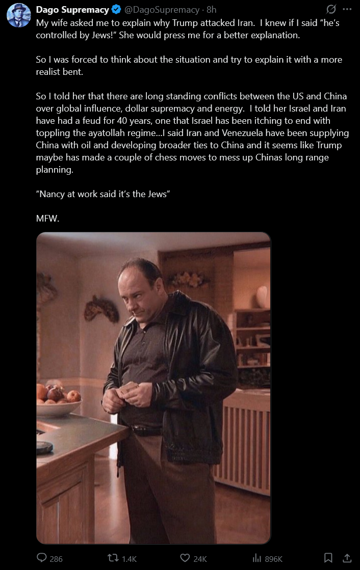 Posting tranny shit while you defend Israel and suck off Trump.