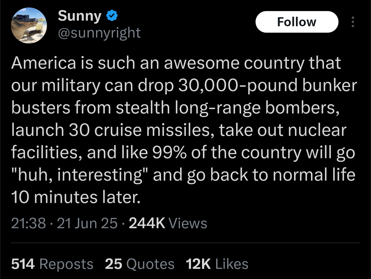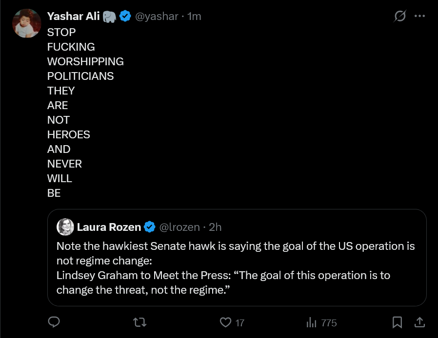 Yes, leftist boomer America is over, I agree. This is Classic America© where we just unapologetically blow up brown people whenever we feel like it and every non-American on earth gets to sit there and watch in abject impotence