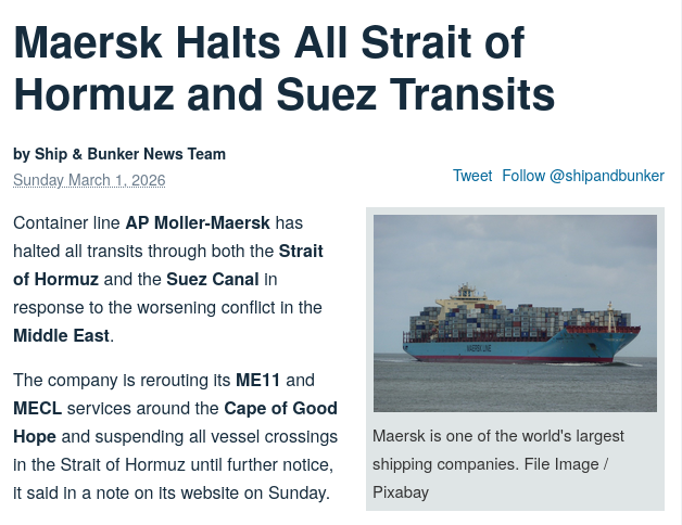 Day: 1Previous: >>529556795▶Latest▶Day 1:>France's aircraft carrier Charles de Gaulle is cutting short its Baltic Sea deployment and heading toward the eastern Mediterranean>Three Gulf countries are going to conduct offensive operations against Iran tonight - Fox News>Trump says U.S. has "destroyed and sunk 9 Iranian Naval Ships" and "largely destroyed" Iran's Naval Headquarters>Since the start of the conflict, Israeli fighter jets have dropped over 2,000 bombs on Iran - IDF>Three US soldiers have been killed and five are seriously wounded in Kuwait during Iranian retaliation - CENTCOM>Saudi Arabia has authorized retaliation against the Iranian regime - CNN>Shipping giant Maersk says it is suspending all vessel transits through the Strait of Hormuz>The number of fatalities in Beit Shemesh, Isreal has risen to 12 - MDA>De-facto Iranian leader Ali Larijani says: "Today we will hit U.S. and Israel with a force that they have never experienced before">Israeli Defense Minister Katz: "From now on, a continuous air bridge will operate to carry out powerful strikes on Tehran"▶Livestreamshttps://www.youtube.com/watch?v=4E-iFtUM2kkhttps://www.youtube.com/watch?v=JHwwZRH2wz8▶Telegramhttps://rentry.org/tgnews▶Twitter accounts (using proxy frontend because twitter's UI is trash):https://nitter.net/clashreporthttps://nitter.net/FaytuksNetworkhttps://nitter.net/sentdefender▶Israel Rocket Alertshttps://www.tzevaadom.co.il/en/▶Air Traffichttps://www.flightradar24.com/https://flightaware.com/livehttps://globe.adsbexchange.com▶Maritime Traffichttps://www.marinetraffic.com/https://www.vesselfinder.com/