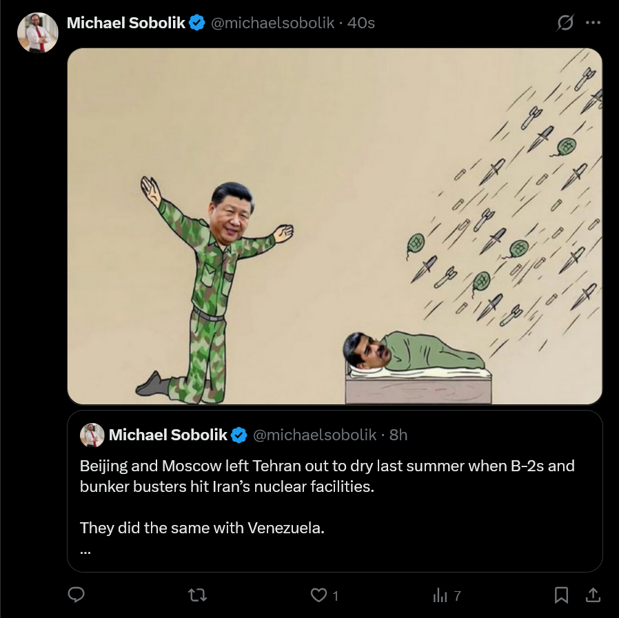 >>529561301 China is basically the only player in its anti-Western bloc that genuinely doesn’t give a shit if the whole thing collapses.They’re not heavily invested beyond the usual Belt-and-Road grift unlike Russia, which has bleed men and money to prop up its proxies like Syria. They also don’t share risky borders with their rivals the way Russia does with NATO.Even better, China could pivot to a more pro-Western stance pretty damn quickly if it ever had to, without changing much internally. Russia, Iran, North Korea, and the rest could never pull that off.It’s not the do nothing and win shit china shills push, but it is do nothing nothing happens.