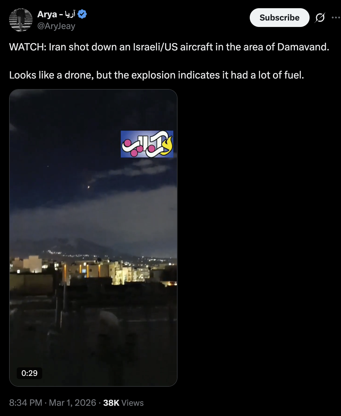 >BREAKING: An unidentified object was downed near Damavand, Iranunclear if it is a drone or a jet