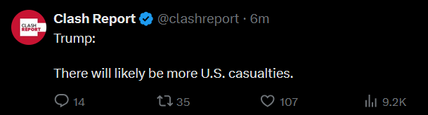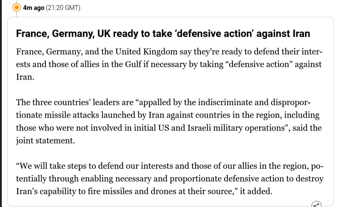 Day: 1Previous: >>529559753▶Latest▶Day 1:>UK, France and Germany considering "defensive action" to destroy Iranian weapon capabilities>France's aircraft carrier Charles de Gaulle is cutting short its Baltic Sea deployment and heading toward the eastern Mediterranean>Three Gulf countries are going to conduct offensive operations against Iran tonight - Fox News>Trump says U.S. has "destroyed and sunk 9 Iranian Naval Ships" and "largely destroyed" Iran's Naval Headquarters>Since the start of the conflict, Israeli fighter jets have dropped over 2,000 bombs on Iran - IDF>Three US soldiers have been killed and five are seriously wounded in Kuwait during Iranian retaliation - CENTCOM>Saudi Arabia has authorized retaliation against the Iranian regime - CNN>Shipping giant Maersk says it is suspending all vessel transits through the Strait of Hormuz>The number of fatalities in Beit Shemesh, Isreal has risen to 12 - MDA>De-facto Iranian leader Ali Larijani says: "Today we will hit U.S. and Israel with a force that they have never experienced before">Israeli Defense Minister Katz: "From now on, a continuous air bridge will operate to carry out powerful strikes on Tehran"▶Livestreamshttps://www.youtube.com/watch?v=4E-iFtUM2kkhttps://www.youtube.com/watch?v=JHwwZRH2wz8▶Telegramhttps://rentry.org/tgnews▶Twitter accounts (using proxy frontend because twitter's UI is trash):https://nitter.net/clashreporthttps://nitter.net/FaytuksNetworkhttps://nitter.net/sentdefender▶Israel Rocket Alertshttps://www.tzevaadom.co.il/en/▶Air Traffichttps://www.flightradar24.com/https://flightaware.com/livehttps://globe.adsbexchange.com▶Maritime Traffichttps://www.marinetraffic.com/https://www.vesselfinder.com/