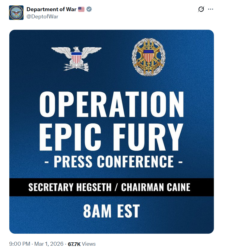 First DoW wartime press conference tomorrow morning at 8AM Eastern.