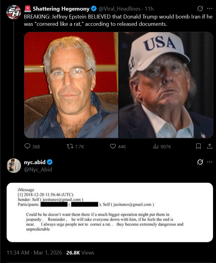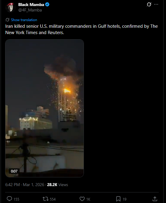 Venezuelan Top propagandist agent "Mamba 4F" producer of the podcast for the torturer in chief and Minister of Internal Affairs, one of the right hands of Maduro and Head of the Socialist party "Diosdado Cabello" whose publically backed Iran's revenge against Israel and USA alongside Iran's ambassador in Venezuela, now posting fake news about the whole war.https://x.com/4F_Mamba/status/2028239548820439083