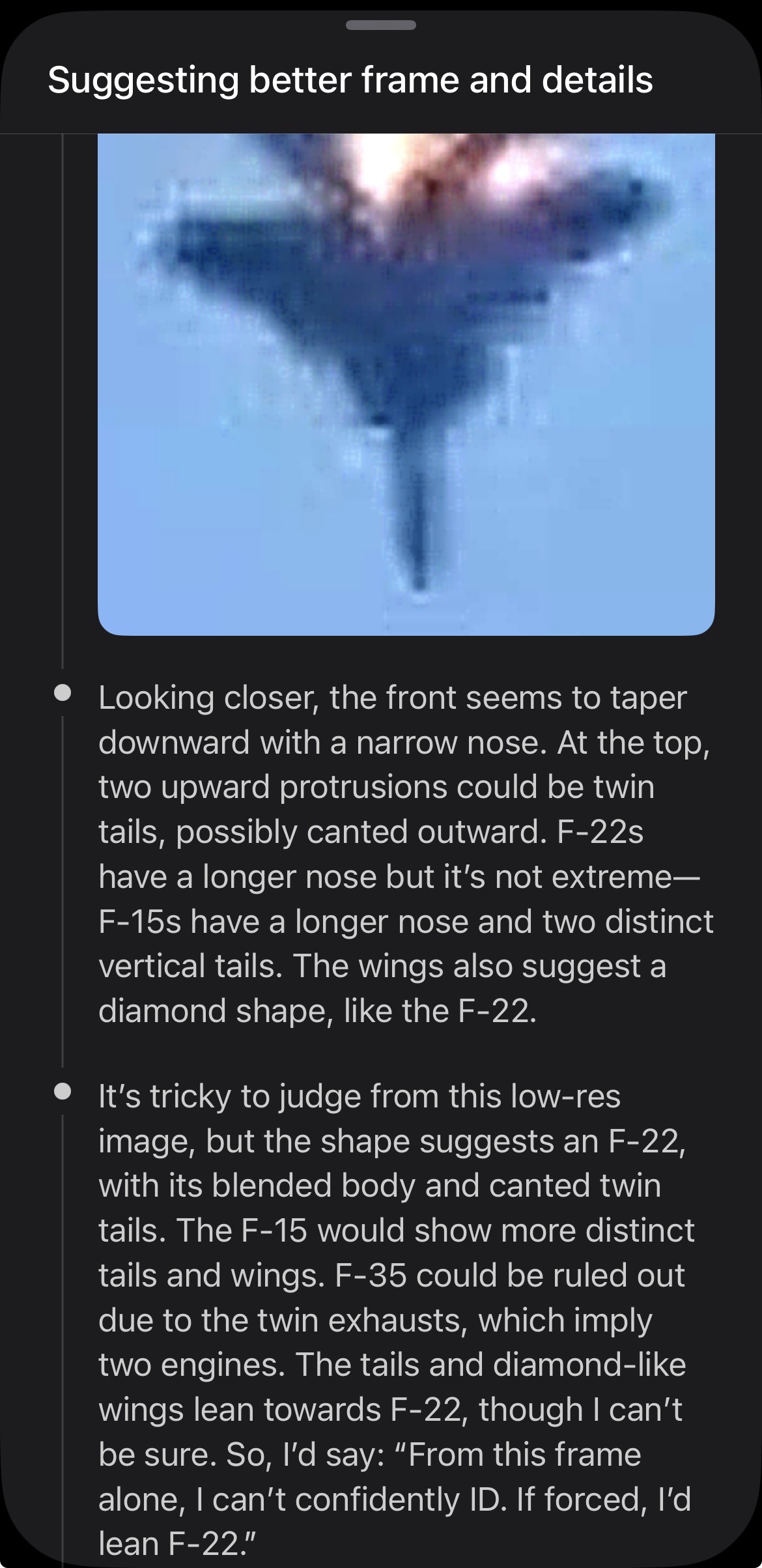 >>529605635Anyways, 80% confidence it’s F-22.I didn’t even expect this.