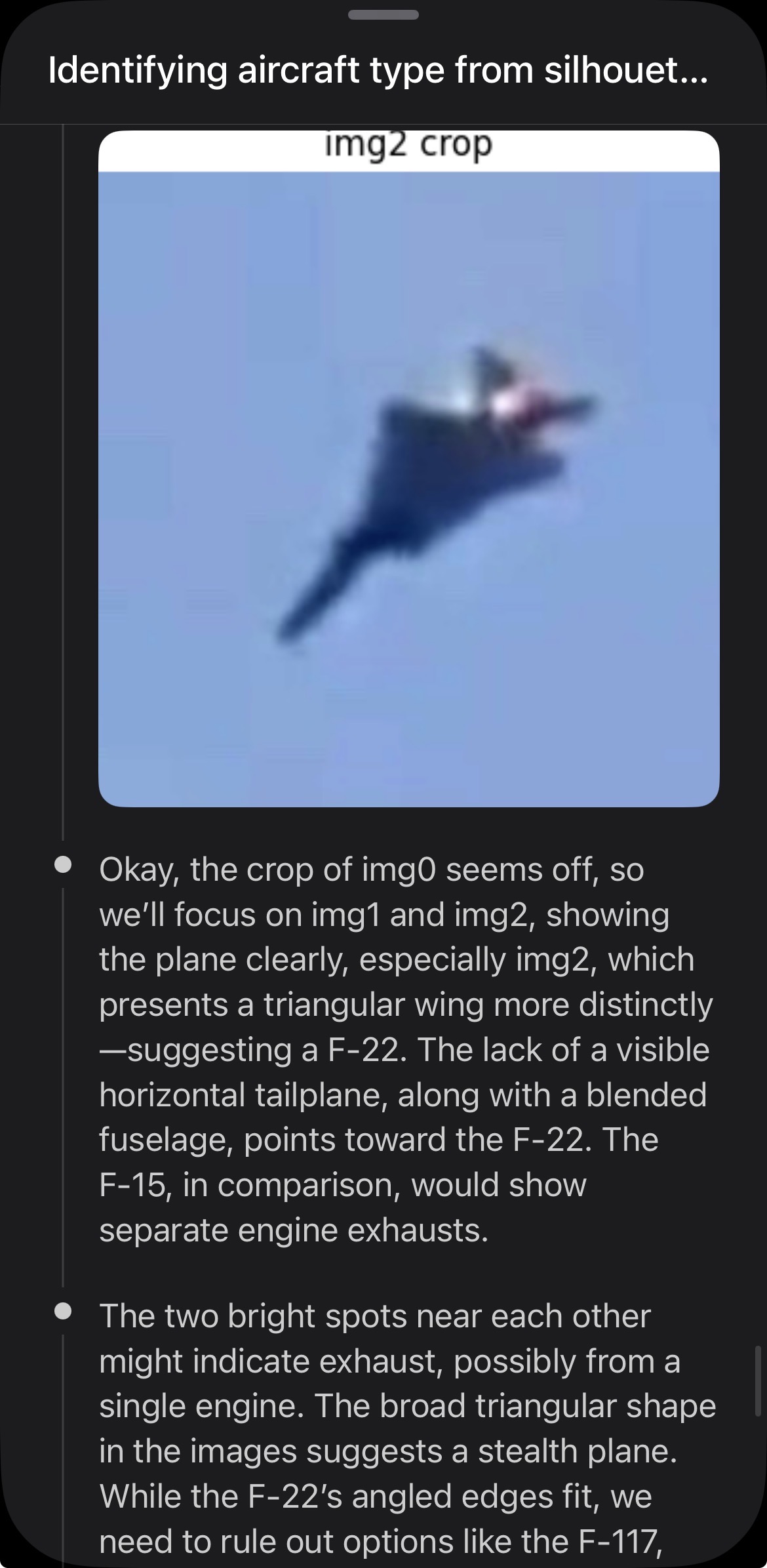 >>529606337Lmao ChatGPT says it’s F-22 and all of you cunts get your panties ina twist.I tie my shoes just fine, you’re talking to someone who is more than likely 1sdev above you in intelligence, at least. Wait let me check this convo, yeah that would be a very conservative eye balled number. You can check the normal distribution graphs if you don’t know what I’m talking about. All I did was prompt it with that picture and asked for me to id the aircraft expecting F-15. I then gave it 10 more screenshots.
