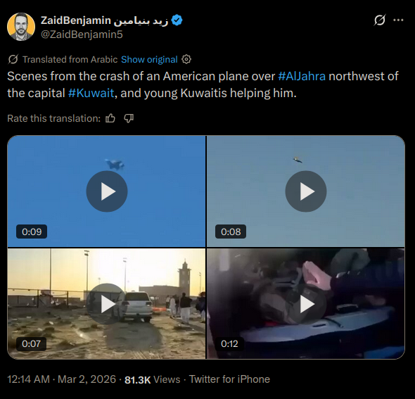 >>529601891Friendly fire over bahrain dudes. Plane fell, pilots ejected, mistaken for enemy, but all cleared up, they are safe. https://x.com/sentdefender/status/2028339721286373482