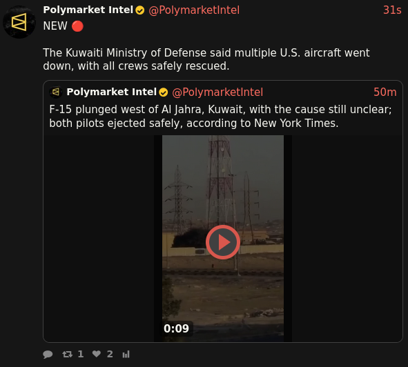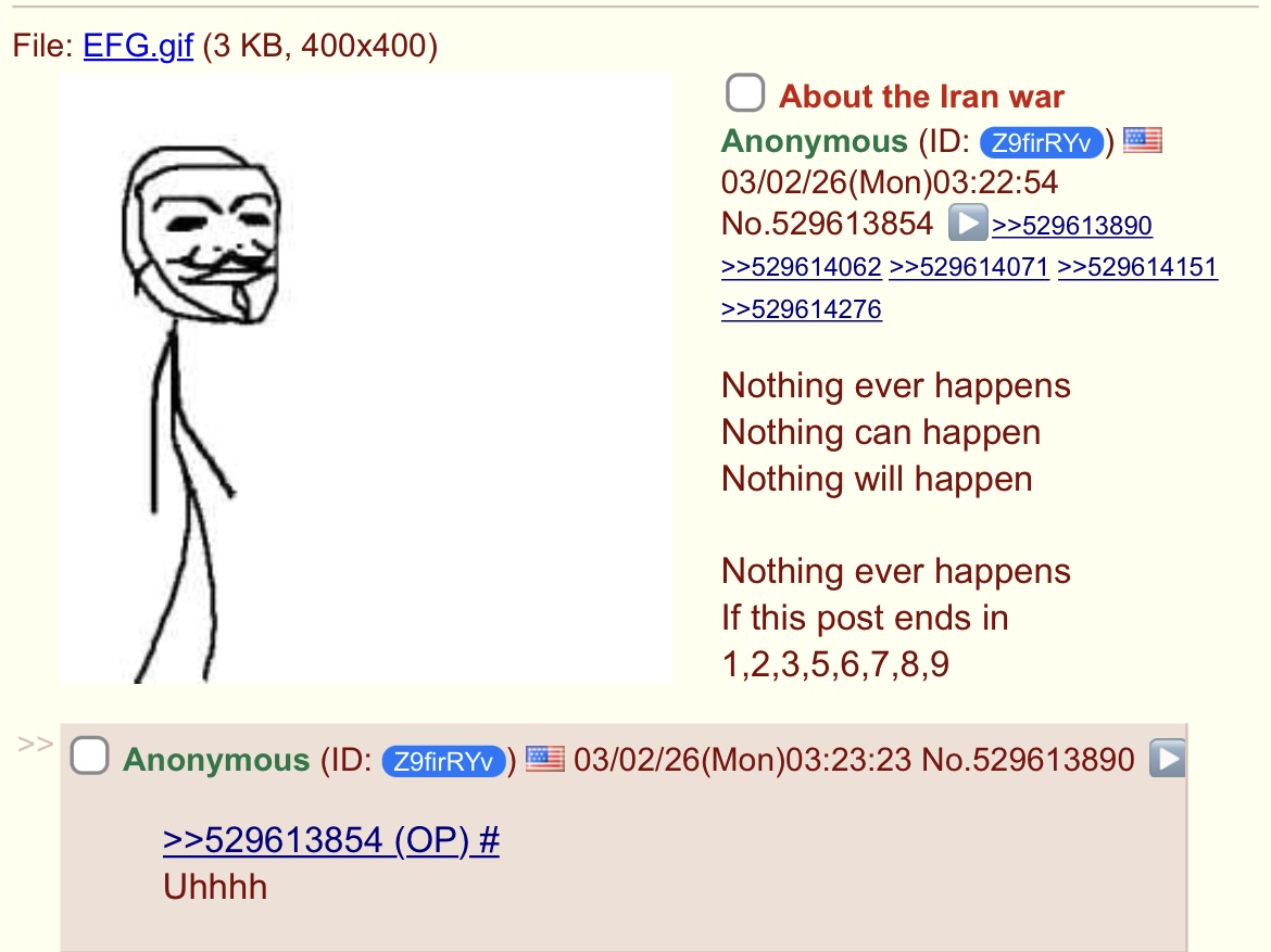 >>529609314yeah there's been a bunch of developments>lots of iranian leaders have died (again)>iranians are asking for peace talks (lol)>hezbollah shoots six rockets, all explode almost immediately, and then 15 minutes later the leader of hezbollah dies >three americans in kuwait died, five others are injured>DOW press conference in 5h, 45m>F-15 shot down due to friendly fire, pilots ejected safely>the UK had their bases attacked multiple times and starmer cucked out because he's afraid of upsetting muslims
