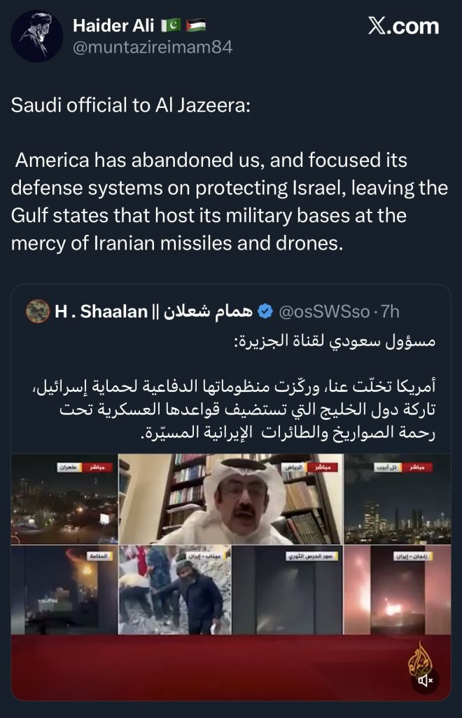 My favorite is how Iran has now formally and militarily shit the bed on every major Arabic player. Bahrain, UAE, Qatar, Jordan and the Saudis. Imagine chimping out so hard that the Arab world now is actively aiding in your destruction alongside the merchants.