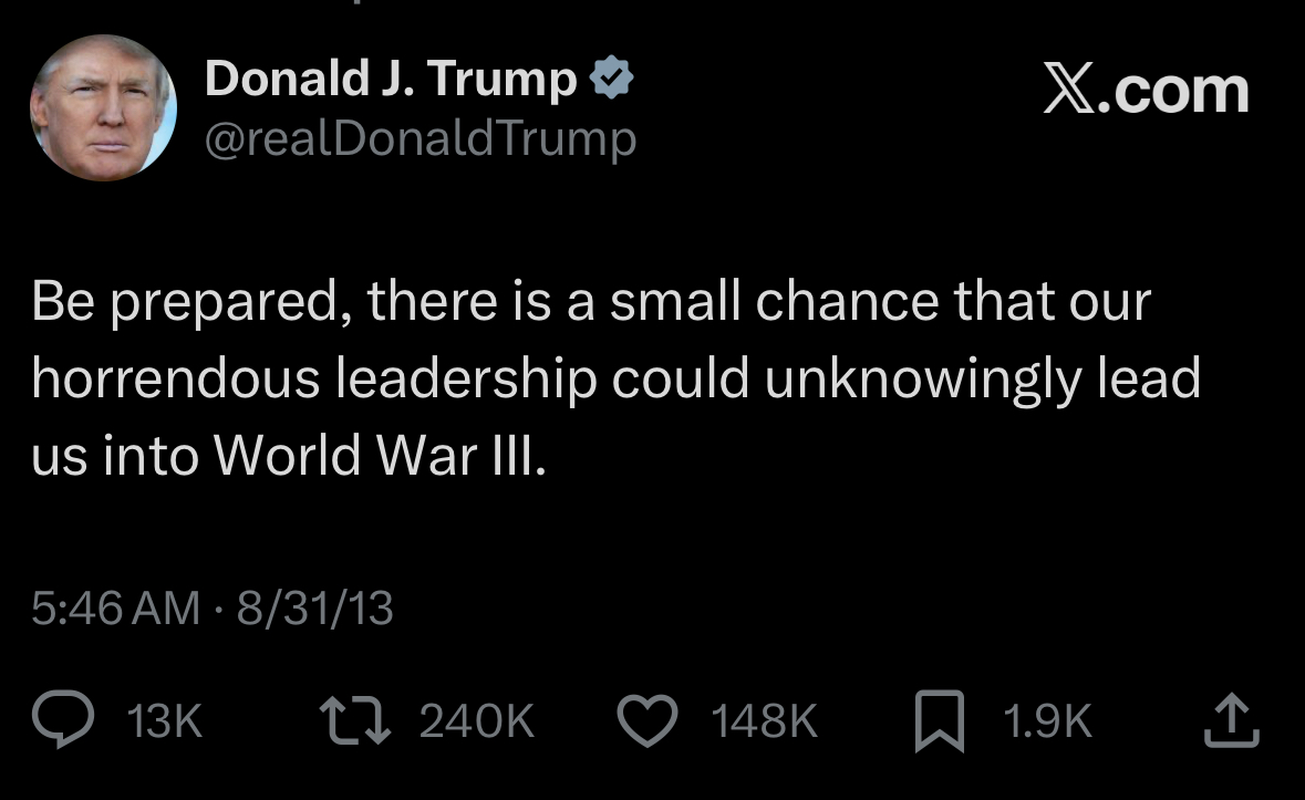 I think you're projecting because you've been arguing with too many shills. I'm simply stating that fact that Trump has put the US into another war. I really don't give a fuck about the democrats.