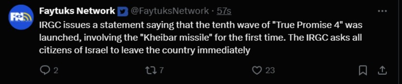 >Israeli Defense Minister Katz: "From now on, a continuous air bridge will operate to carry out powerful strikes on Tehran"
