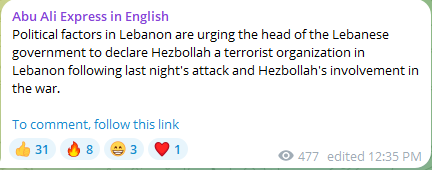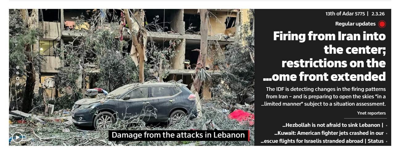 >Hezbollah joins the war, Israel retailiates with airstrikes on Beirut; does not rule out invasion