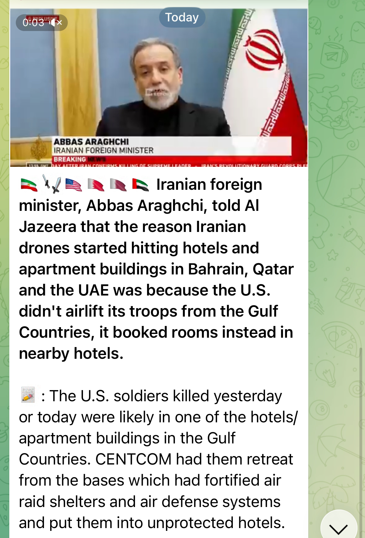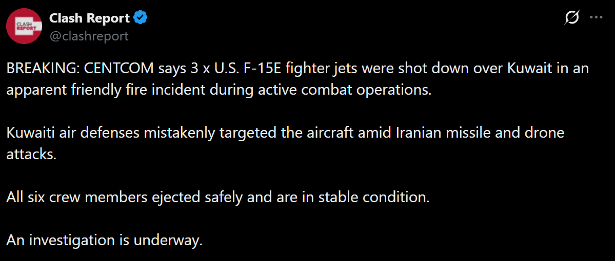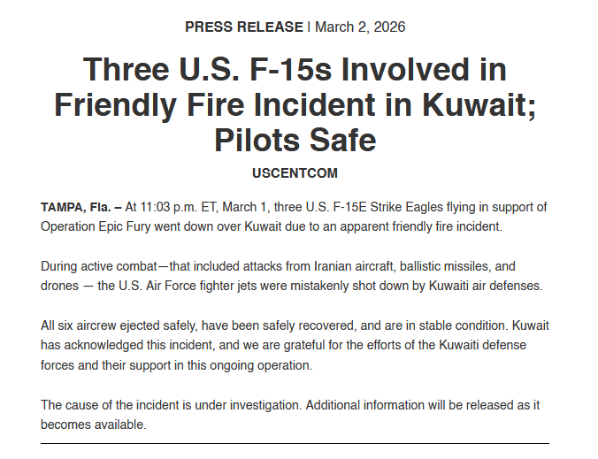 >Three US soldiers have been killed and five are seriously wounded in Kuwait during Iranian retaliation - CENTCOM
