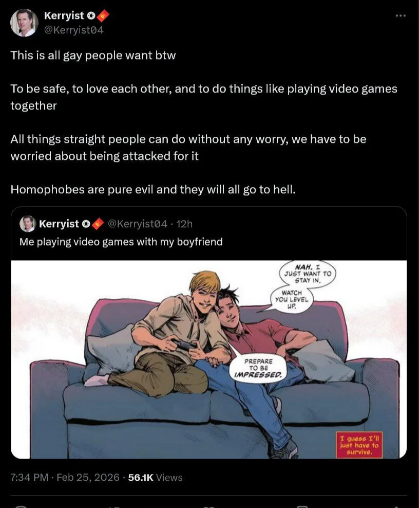 The problem with the "gay community" other than being ridiculously artificial is that you don't enforce any moral standards. Hell you don't even have any moral standards to enforce, you've rejected the idea wholesale because Jeebus is a meany and said no buttstuff. You enable the bug chasers, kiddy diddlers, balding troon bathroom bandits and several dozen more species of reprobate. You inflict an increasingly immoral subculture upon the populace at large and insist any objection is simply "bigotry" while the list of abuses mount and then foolish wonder why the normie feels only fatigue towards you and why the fundamentalists who actually hate you are galvanized.