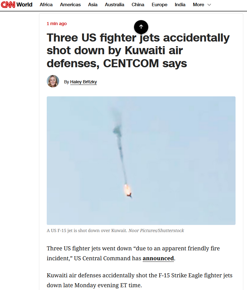 Three f15's shot down by Kuwait>"it was an accident"CNN:https://www.cnn.com/world/live-news/iran-israel-us-attack-03-02-26-intl-hnk#cmm92owap00003b6sg87nbljeWho buys this bullshit?