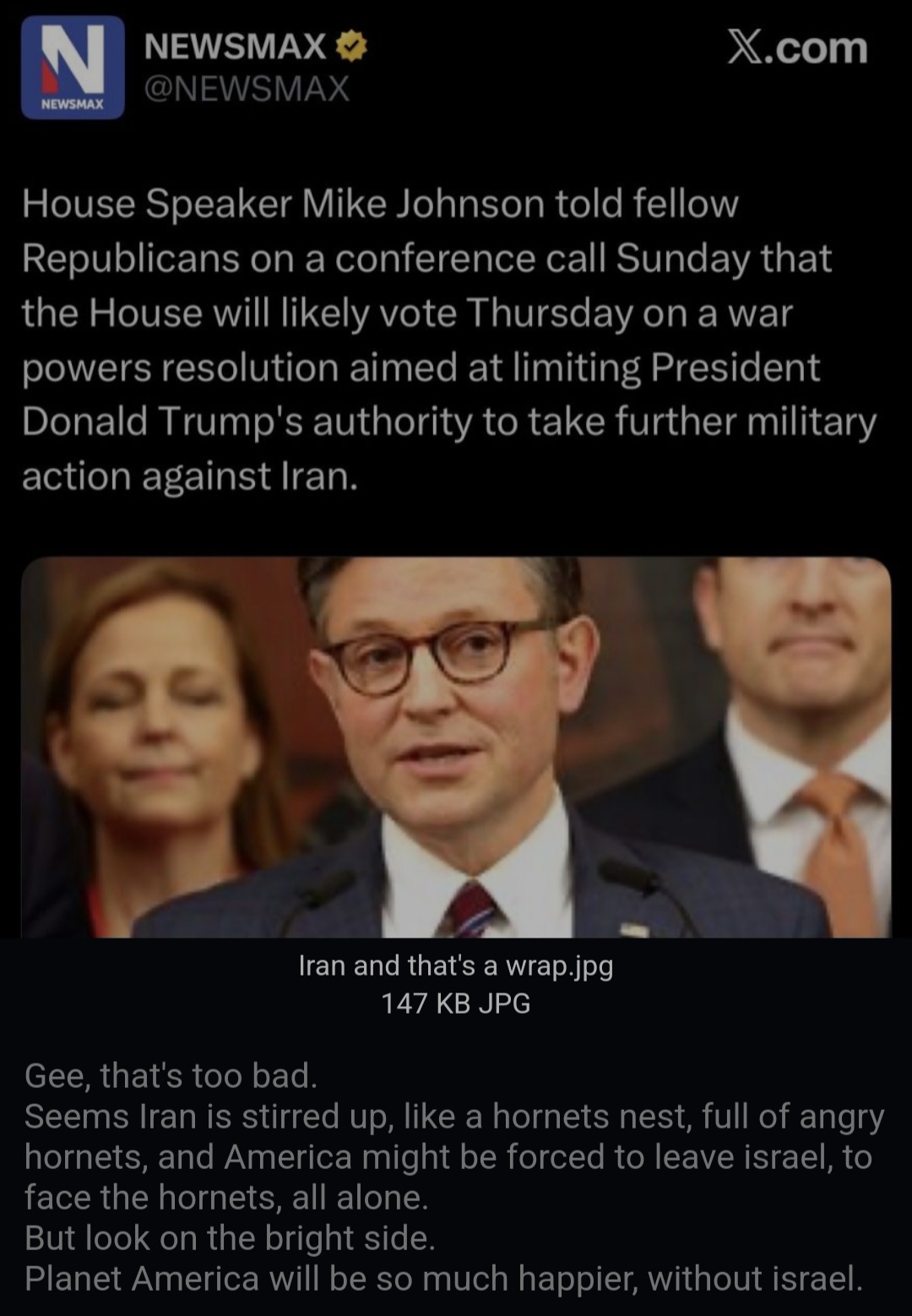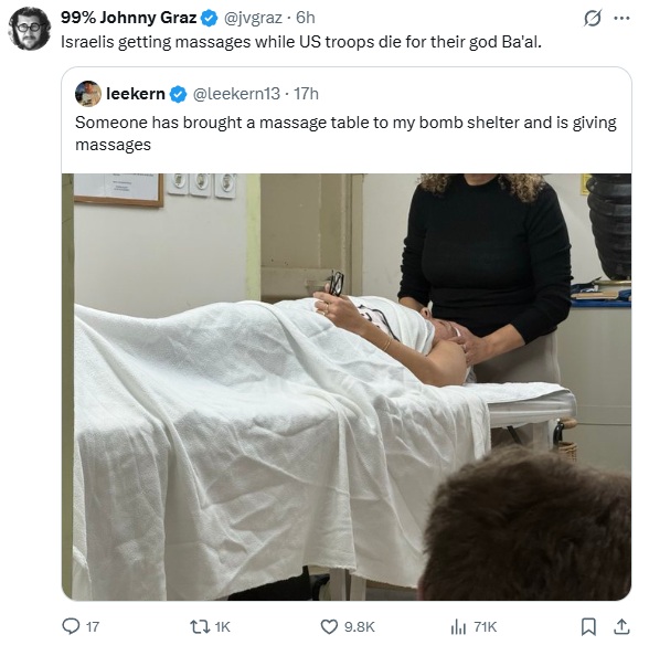 Stay mad.Another interesting possibility... What if POTUS is using this to destroy the Israel variable to the equation? Iran struck and damaged the primary desalination plant at Haifa - no fresh water in a desert, despite their water treatment. Bibi fled, denied entry to multiple countries, allowed into Germany of all places, despite ICC arrest warrants. Israeli infrastructure being destroyed, civilians killed in Tel Aviv while their PM fled.