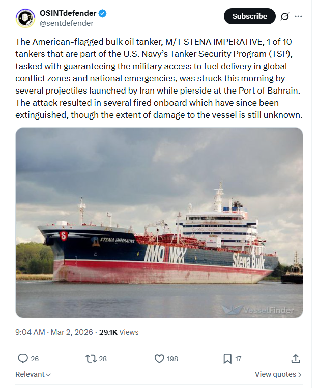 The American-flagged bulk oil tanker, M/T STENA IMPERATIVE, 1 of 10 tankers that are part of the U.S. Navy’s Tanker Security Program (TSP), tasked with guaranteeing the military access to fuel delivery in global conflict zones and national emergencies, was struck this morning by several projectiles launched by Iran while pierside at the Port of Bahrain. The attack resulted in several fired onboard which have since been extinguished, though the extent of damage to the vessel is still unknown. March 2nd, 2026 https://x.com/sentdefender/status/2028471623108395180